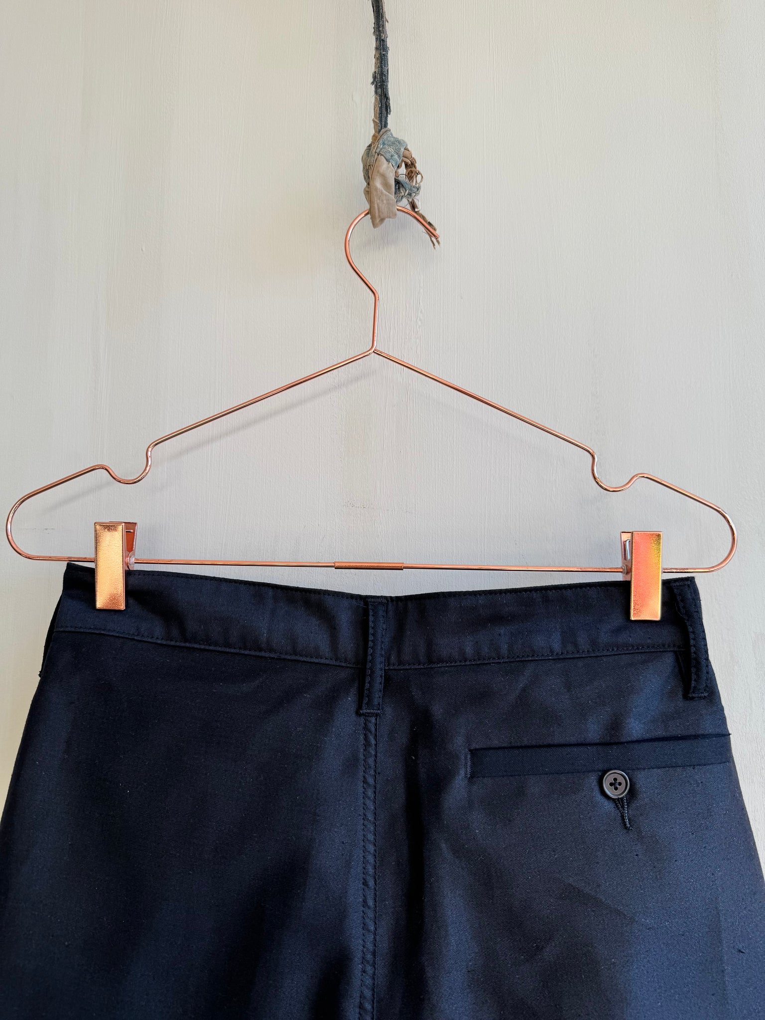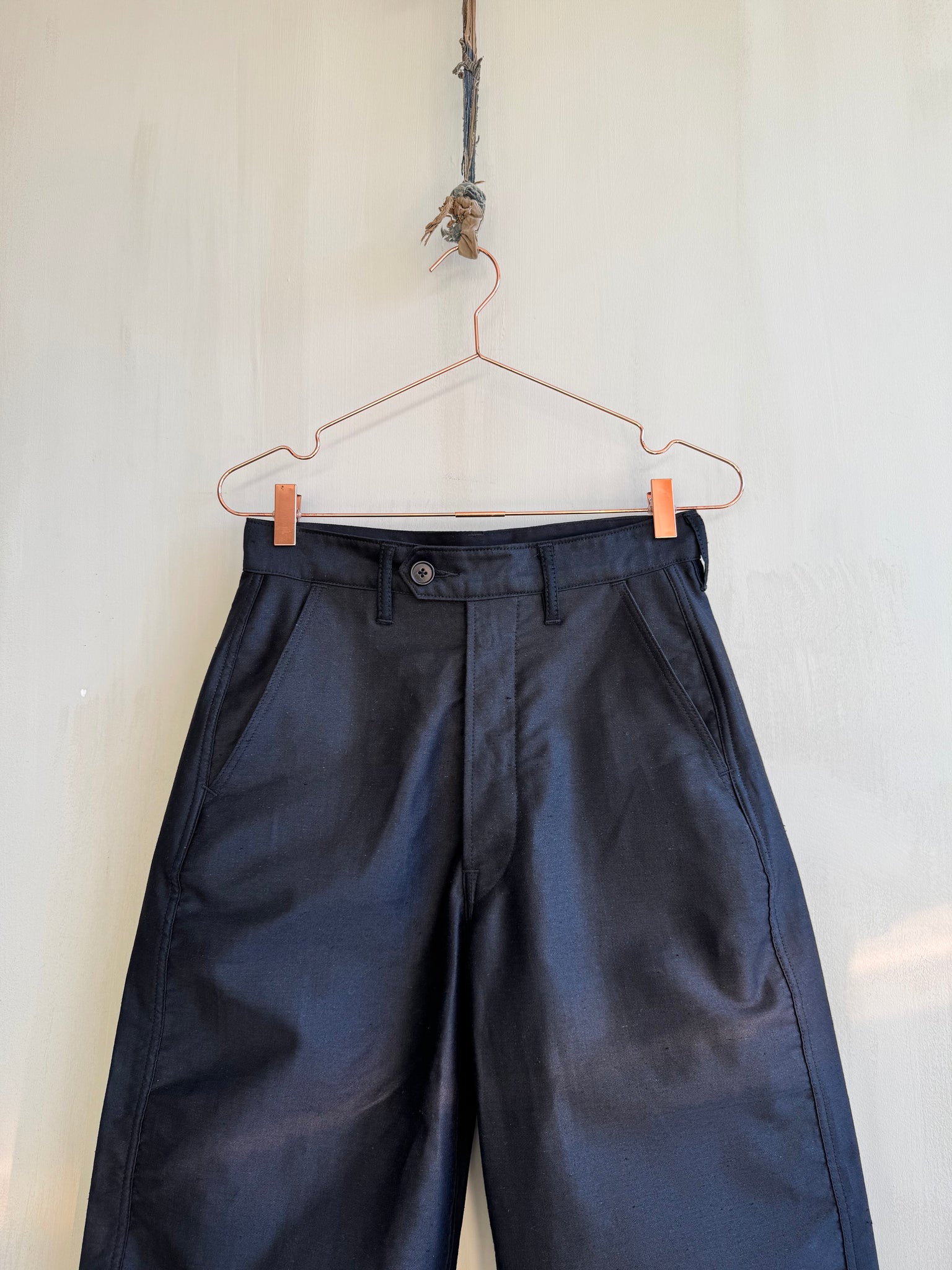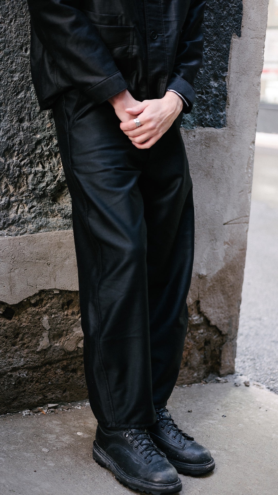 This limited edition unisex French workwear trousers are inspired from the classic 80's-90's French painter workwear aesthetic. The collection is limited due to the rare find of French premium deadstock black selvedge lightweight moleskin dates to the 1940s. The design showcases a refined silhouette with a relaxed hip that transitions into a sharp taper toward the leg opening. The intended shortened inseam updates the silhouette to contemporary aesthetic. Authentic detailing completes the design: a single rear pocket, dual front pockets, button fly closure, and completed with 1970's deadstock made-in Toronto Corozo buttons.