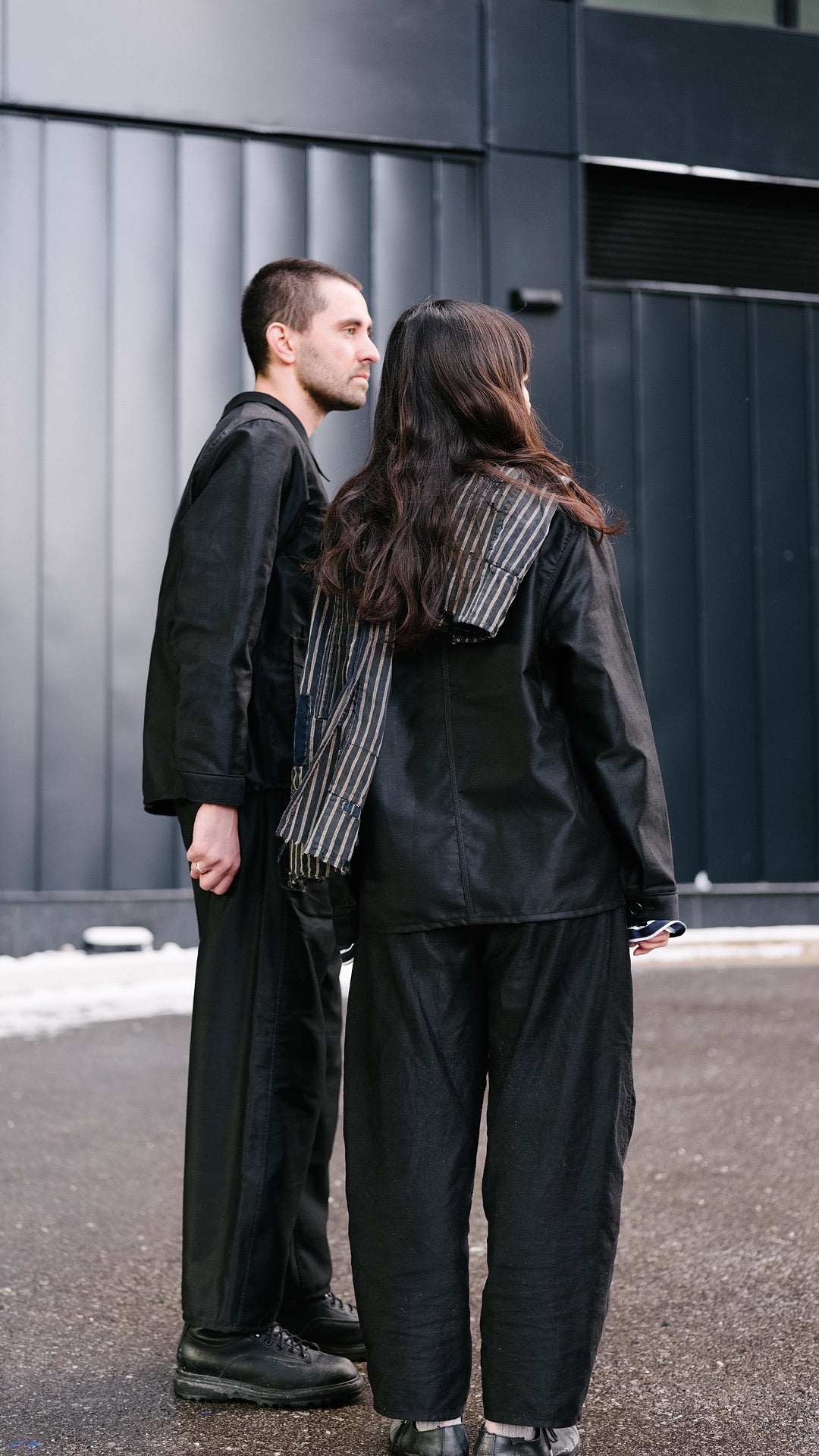 Satoko (5'4/163cm and 110lbs/50kg) wears size 28" for trousers and size small for the lightweight black moleskin chore coat.
