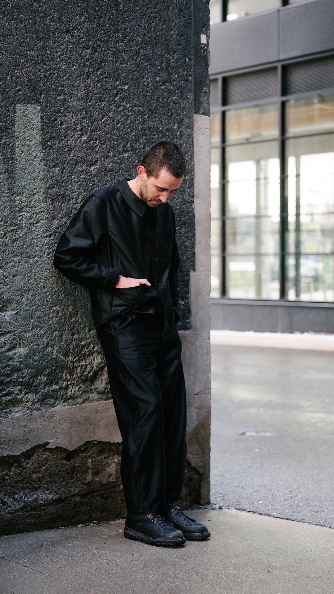 Sebastian (5'11/180cm and 145lbs/65kg) wears size 32" for trousers and size large for the lightweight black moleskin chore coat.