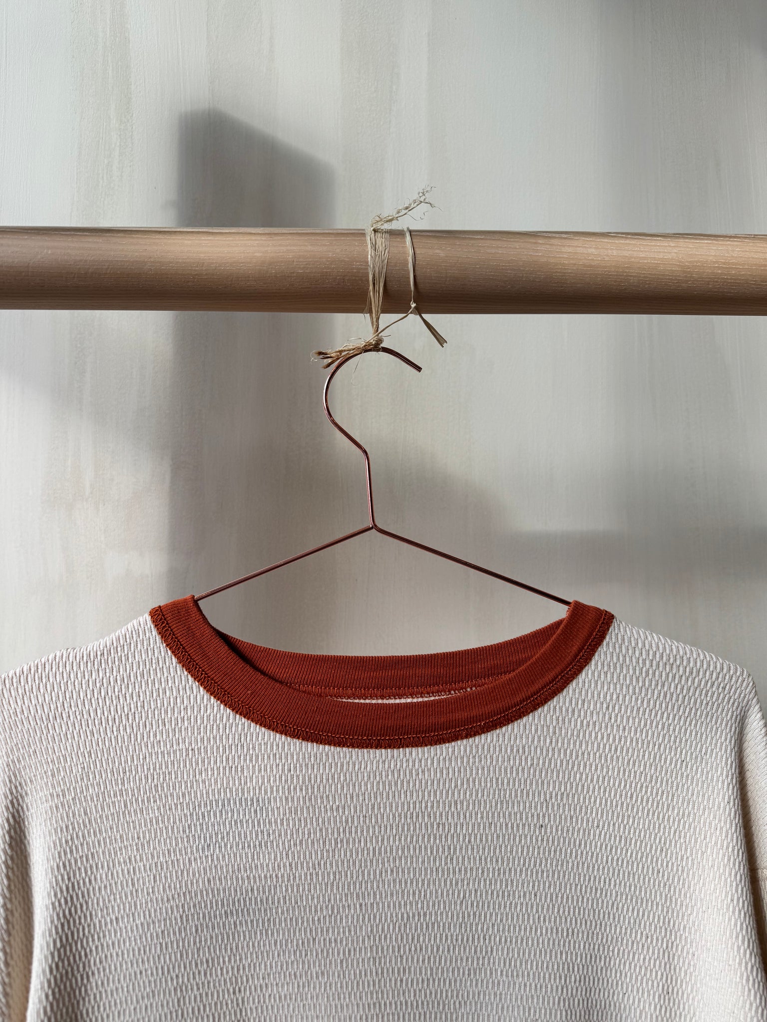 This long-sleeve is made from premium Japanese woven thick cotton waffle fabric, detailing with orange ribbing at the neck and cuffs for a vibrant accent, and a discreet small pocket close to the hem. The elongated cuffs are designed to carry the old school aesthetics and the flatlock stitching from Union Special machinery delivers comfort through flattening seams. This long sleeve is a great addition for colder seasons with its substantial weight and thermal properties. It has been pre washed to minimize shrinkage.