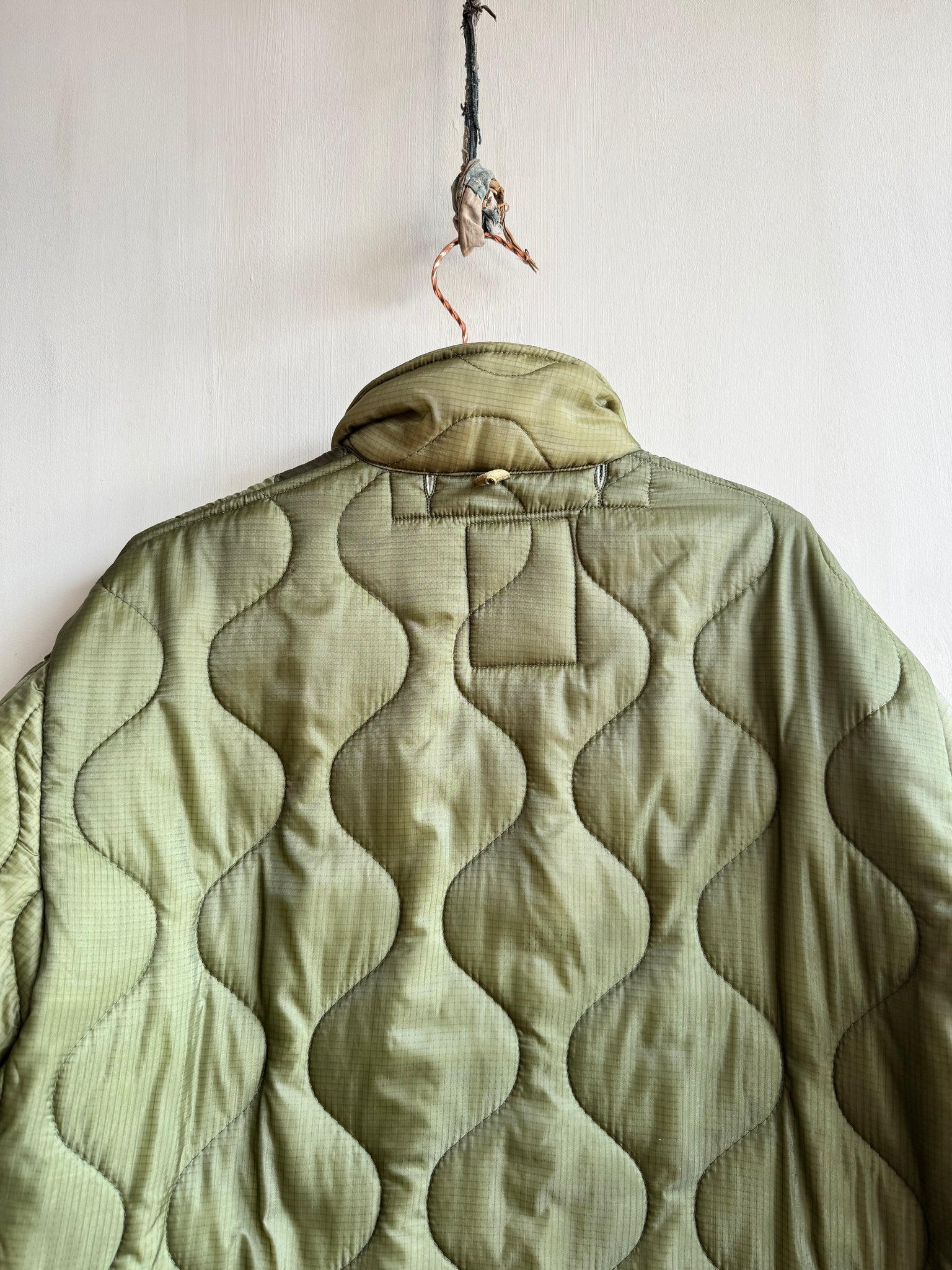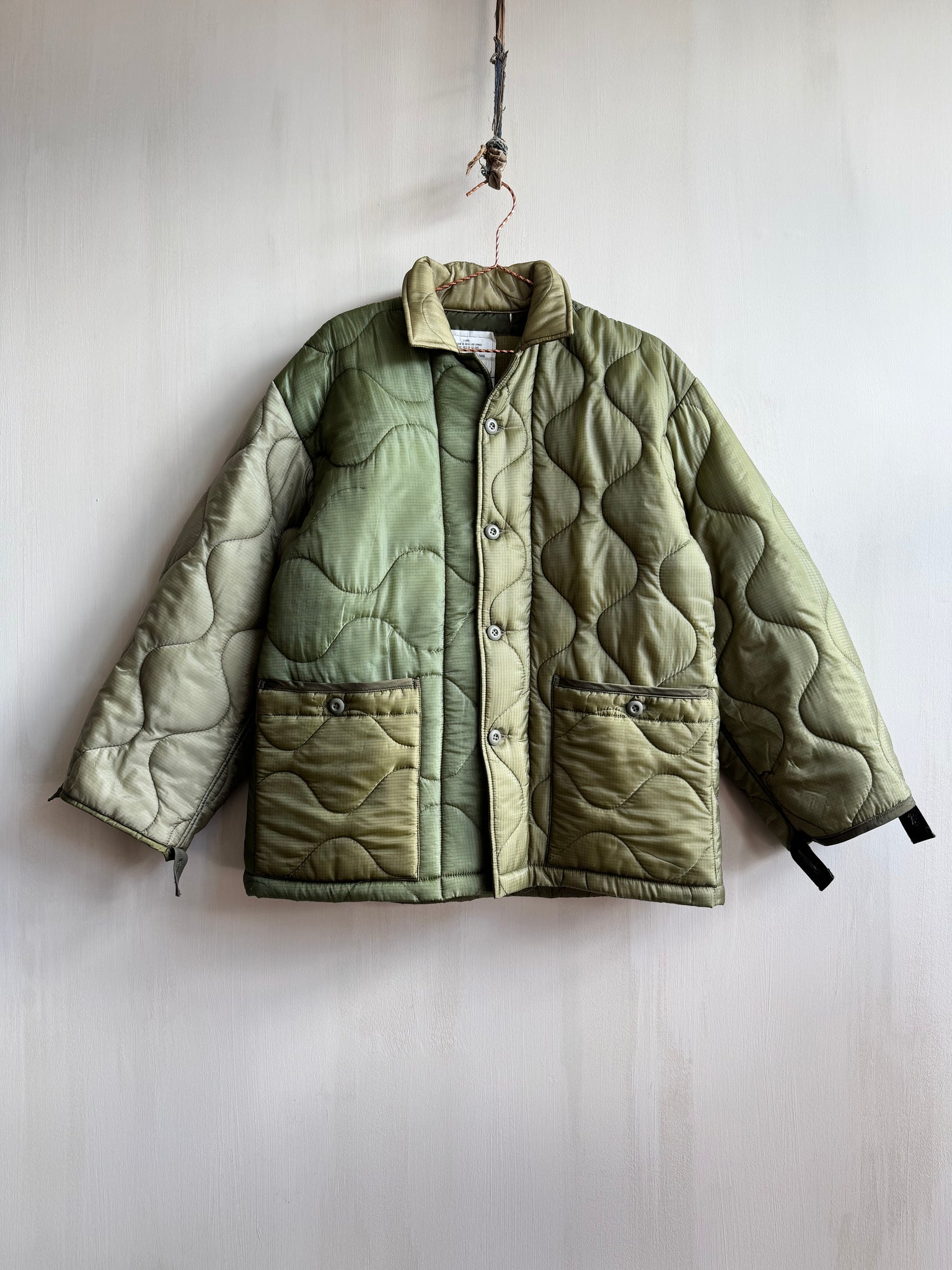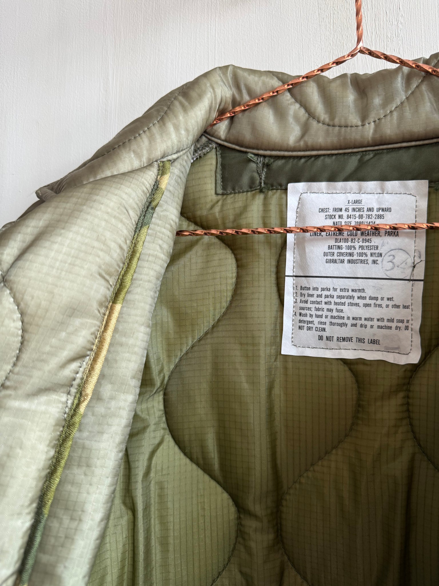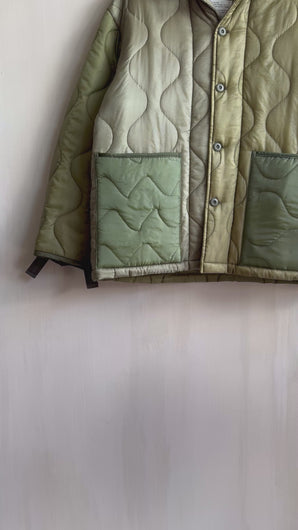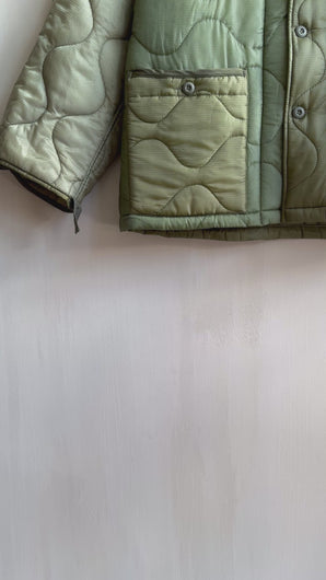 Reconstructed from authentic military M65 quilted parka liners, this unisex reworked quilted coat blends the originality with the purposeful contemporary design. Each one of the kind piece features original manufacturer tags and sleeves integrated directly into the design, serving as tangible proof of authenticity. The coat is individually designed and made with detailed features, dual utility pockets, reinforced back hook for hanging, patched works pattern, and authentic duck camo parachute fabric used as binding.